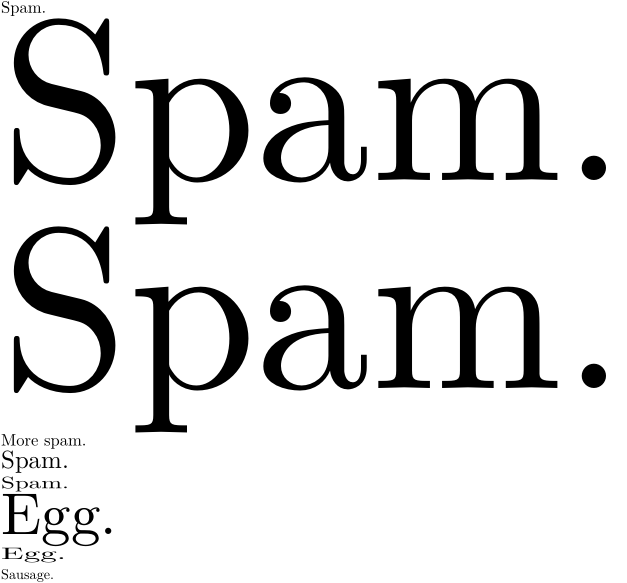 \setuppapersize[A5] Spam. \\ \scale[factor=fit] {Spam.} \\ \scale[wfactor=max] {Spam.} \\ More spam. \\ \scale[scale=1500] {Spam.} \\ \scale[xscale=1500] {Spam.} \\ \scale[lines=2] {Egg.} \\ \scale[sx=2] {Egg.} \\ \scale[grid=halfline]{Sausage.} \\