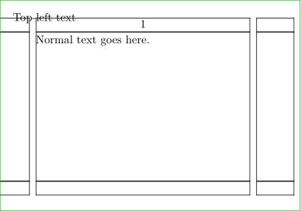 \setuppapersize[A8,landscape] \showframe \definelayer[mwe][repeat=yes, preset=lefttop, hoffset=.125in, voffset=.125in] \setupbackgrounds[page][background=mwe] \setlayer[mwe] {Top-left text} \starttext Normal text goes here. \stoptext