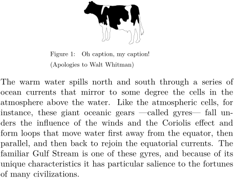 \setuppapersize[A6] \setupexternalfigures[location=default] \setupcaptions[ style={\tfx\setupinterlinespace[line=10pt]}, headstyle=\rm, numberstopper={:}] \placefigure {Oh caption, my caption!\crlf (Apologies to Walt Whitman)} {\externalfigure[cow][width=2cm]} \input linden