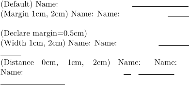 \setuppapersize[A7] \showframe (Default) \fillinline{Name:} (Margin 1cm, 2cm) \fillinline[margin=1cm]{Name:} \fillinline[margin=2cm]{Name:} (Declare margin=0.5cm) \setupfillinlines[margin=0.5cm] (Width 1cm, 2cm) \fillinline[width=1cm]{Name:} \fillinline[width=2cm]{Name:} (Distance 0cm, 1cm, 2cm) \fillinline[distance=0cm]{Name:} \fillinline[distance=1cm]{Name:} \fillinline[distance=2cm]{Name:}