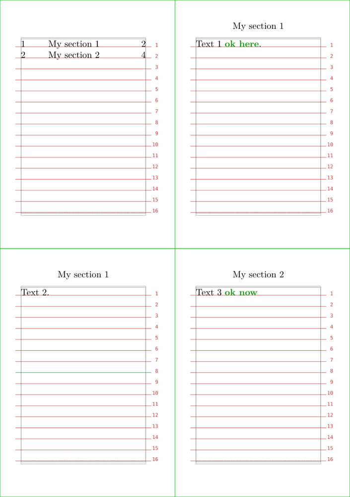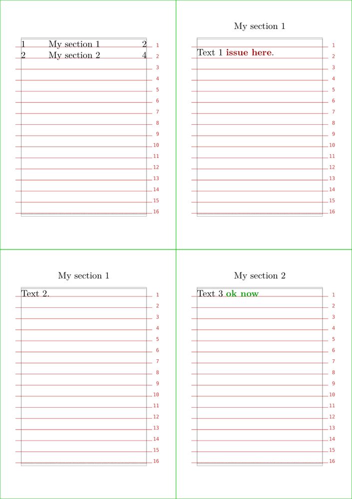 \definepapersize[sheet] [width=148mm,height=210mm] \setuppapersize[A7][sheet] \setuppaper[nx=2,ny=2] \setuparranging[XY] \showframe[edge] \showgrid \setupbodyfont[11pt] \setuphead [section] [placehead=hidden, beforesection={\page}, after={\dontleavehmode\synchronizehead{section}},] \setupheadertexts[section] \starttext \placecontent\page \startsection[title={My section 1}] Text 1 \color[darkgreen]{\bf ok here}. {\synchronizehead{section}} \page Text 2. \stopsection \startsection[title={My section 2}] Text 3 \color[darkgreen]{\bf ok now} {\synchronizehead{section}} \page Text 4. \stopsection \stoptext