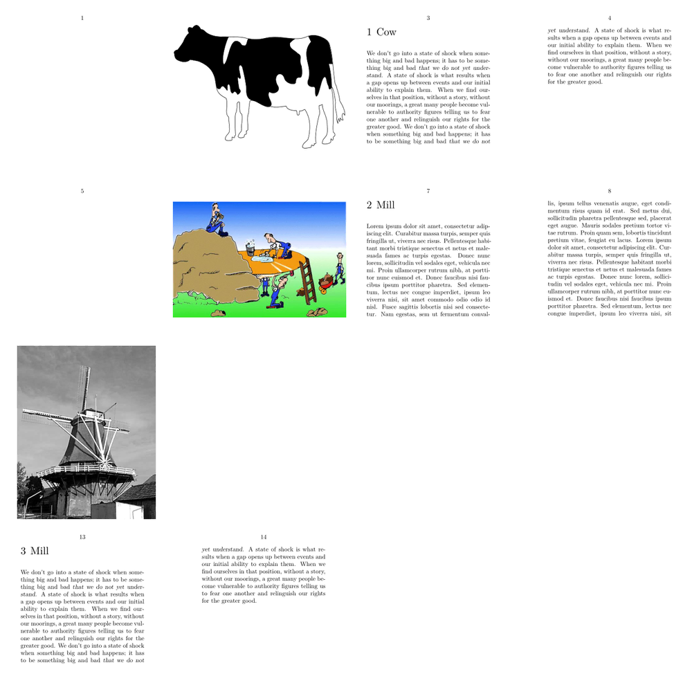 % to render examples in the wiki \definepapersize[sheet][width=24cm,height=24cm] \definepapersize[page][width=6cm,height=6cm] \setuppapersize[page][sheet] \setuppaper[nx=4, ny=4] \setuparranging [XY] \setupbodyfont[6pt] % actual example starts here \setupexternalfigures [location=default] \setuppagenumbering [alternative=doublesided] \definepageinjection [chapter:start] [empty] [page=left] \definepageinjection [chapter:insert] [previouspage] [pagestate=stop,width=\paperwidth] \setuphead [chapter] [beforesection={\pageinjection[chapter:start]}, insidesection={\pageinjection[chapter:insert][name=\structureuservariable{image}]}] \starttext \startchapter [title={Cow}] [image=cow] \dorecurse{2}{\samplefile{klein}} \stopchapter \startchapter [title={Mill}] [image=hacker] \dorecurse{4}{\samplefile{lorem}} \stopchapter \startchapter [title={Mill}] [image=mill] \dorecurse{2}{\samplefile{klein}} \stopchapter \stoptext