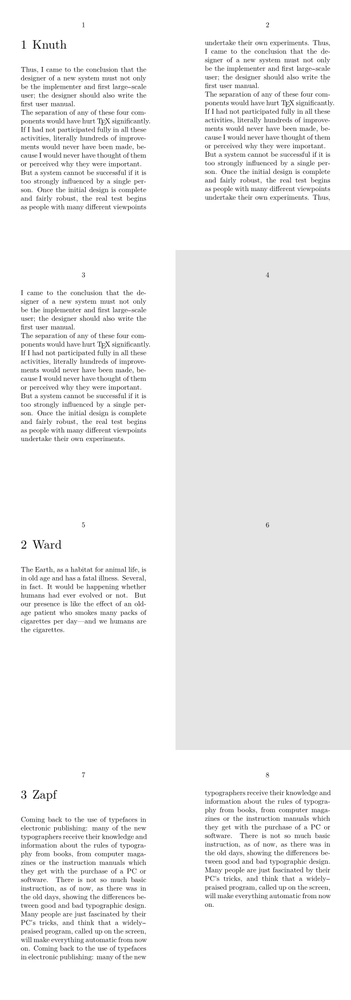 % next five lines just to show the effect on this wiki \definepapersize[sheet] [width=104mm,height=296mm] \setuppapersize[A8][sheet] \setuppaper[nx=2, ny=4] \setuplayout[page][location=middle, marking=on] \setuparranging [XY] \setupbodyfont[6pt] % actual example starts here \setuppagenumbering [alternative=doublesided] \startsetups [chapter:before] \doifoddpageelse {} {\pushbackground[page] \setupbackgrounds[page][background=color,backgroundcolor=gray] \page[right] \popbackground} \stopsetups \setuphead [chapter] [page=yes, before=\directsetup{chapter:before}] \starttext \startchapter[title={Knuth}] \dorecurse{3}{\samplefile{knuth}} \stopchapter \startchapter[title={Ward}] \dorecurse{1}{\samplefile{ward}} \stopchapter \startchapter[title={Zapf}] \dorecurse{2}{\samplefile{zapf}} \stopchapter \stoptext
