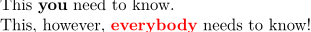 \definehighlight [important] [style=bold] %% define a highlight \definehighlight [reallyimportant] [important] %% inherit setups \setuphighlight [reallyimportant] [color=red] %% modify the copy \starttext \startTEXpage This \important{you} need to know.\par This, however, \reallyimportant{everybody} needs to know! \stopTEXpage \stoptext