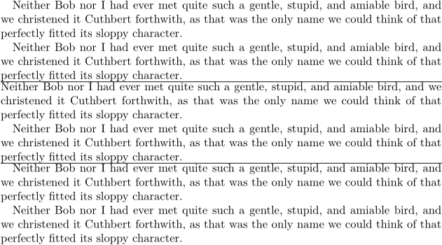 \setuppapersize[A5] % The quotation is from "Three Tickets to Adventure", by Gerald Durrell. \def\testpar{ Neither Bob nor I had ever met quite such a gentle, stupid, and amiable bird, and we christened it Cuthbert forthwith, as that was the only name we could think of that perfectly fitted its sloppy character. \par} % `first` is on by default \setupindenting[yes, small] \testpar \testpar \hairline % to disable indentation of the first paragraph, use `next` \setupindenting[next] \testpar \testpar \hairline % to re-enable indentation of the first paragraph on again, use `first` \setupindenting[first] \testpar \testpar