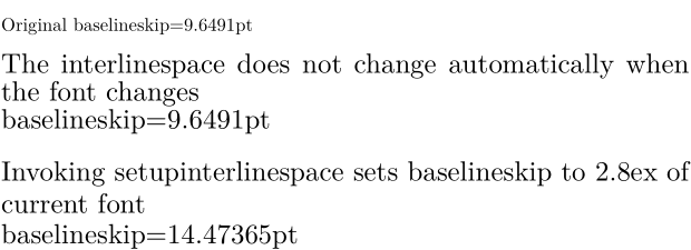 \setupwhitespace[big] Original baselineskip=\the\baselineskip { \definedfont[Serif at 12pt] The interlinespace does not change automatically when the font changes\crlf baselineskip=\the\baselineskip } { \definedfont[Serif at 12pt] \setupinterlinespace Invoking setupinterlinespace sets baselineskip to 2.8ex of current font\crlf baselineskip=\the\baselineskip }