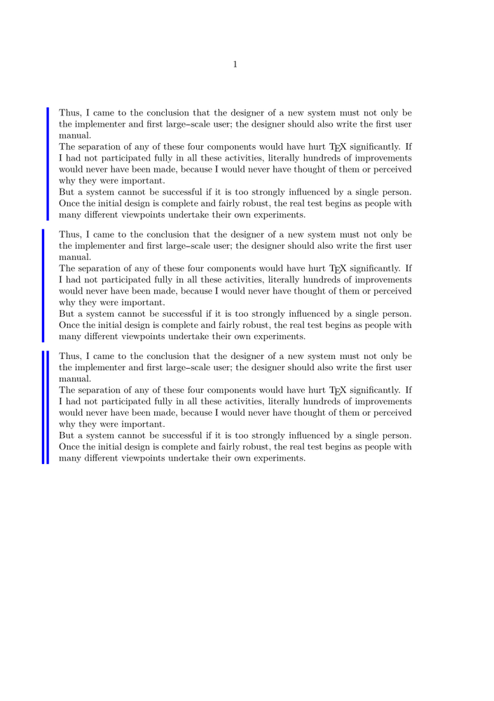 \setupmarginrules[rulecolor=blue,rulethickness=2pt] \setuppapersize[A5] \starttext \startmarginrule[1] \input knuth \stopmarginrule \blank \startmarginrule[2] \input knuth \stopmarginrule \blank \startmarginrule[1] \startmarginrule[2] \input knuth \stopmarginrule \stopmarginrule \stoptext
