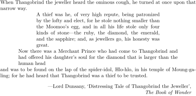\setuppapersize[A5] \setupnarrower[middle=1cm, left=2cm, right=2cm] When Thangobrind the jeweller heard the ominous cough, he turned at once upon that narrow way. \startnarrower[left,right] A thief was he, of very high repute, being patronized by the lofty and elect, for he stole nothing smaller than the Moomoo's egg, and in all his life stole only four kinds of stone---the ruby, the diamond, the emerald, and the sapphire; and, as jewellers go, his honesty was great. \stopnarrower % \startnarrower without any arguments is equivalent to \startnarrower[middle] \startnarrower Now there was a Merchant Prince who had come to Thangobrind and had offered his daughter's soul for the diamond that is larger than the human head \stopnarrower and was to be found on the lap of the spider-idol, Hlo-hlo, in his temple of Moung-ga-ling; for he had heard that Thangobrind was a thief to be trusted. \blank \rightaligned{---Lord Dunsany, \quote{Distressing Tale of Thangobrind the Jeweller},} \rightaligned{{\it The Book of Wonder}}