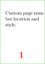 \setuppapersize[A10] \setuppagenumbering[location={footer,middle},style=\bfc,color=red] \showframe[edge] \starttext Custom page number location and style. \stoptext