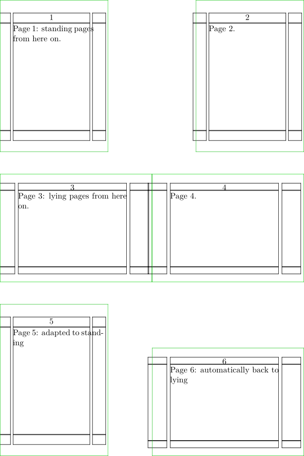 % Create a paper that can accomodate 2x4 squares of 52x52mm % (A9 is 37x52mm, and we're placing it both portrait and landscape) \definepapersize[sheet][width=104mm,height=156mm] % We want 2x3 pages on a sheet. \setuppaper must come *before* \setuparranging! \setuppaper[nx=2, ny=3, dx=0mm, dy=0mm] \setuparranging[XY] % Define two papersizes in terms of A9 and sheet \definepapersize[standing][A9] [sheet] \definepapersize[lying] [A9,landscape][sheet] % Show the pages. \showframe \starttext \setuppapersize[standing] Page 1: standing pages from here on. \page Page 2. \page \setuppapersize[lying] Page 3: lying pages from here on. \page Page 4. \page \adaptpapersize[standing] Page 5: adapted to standing \page Page 6: automatically back to lying \page \stoptext