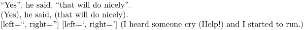 \enableregime[utf] \quotation{Yes}, he said, \quotation{that will do nicely}. \setupquotation[left=(, right=)] \quotation{Yes}, he said, \quotation{that will do nicely}. \setupquotation[1][left=“, right=”] \setupquotation[2][left=‘, right=’] \quotation{I heard someone cry \quotation{Help!} and I started to run.}