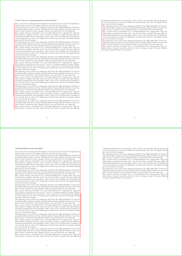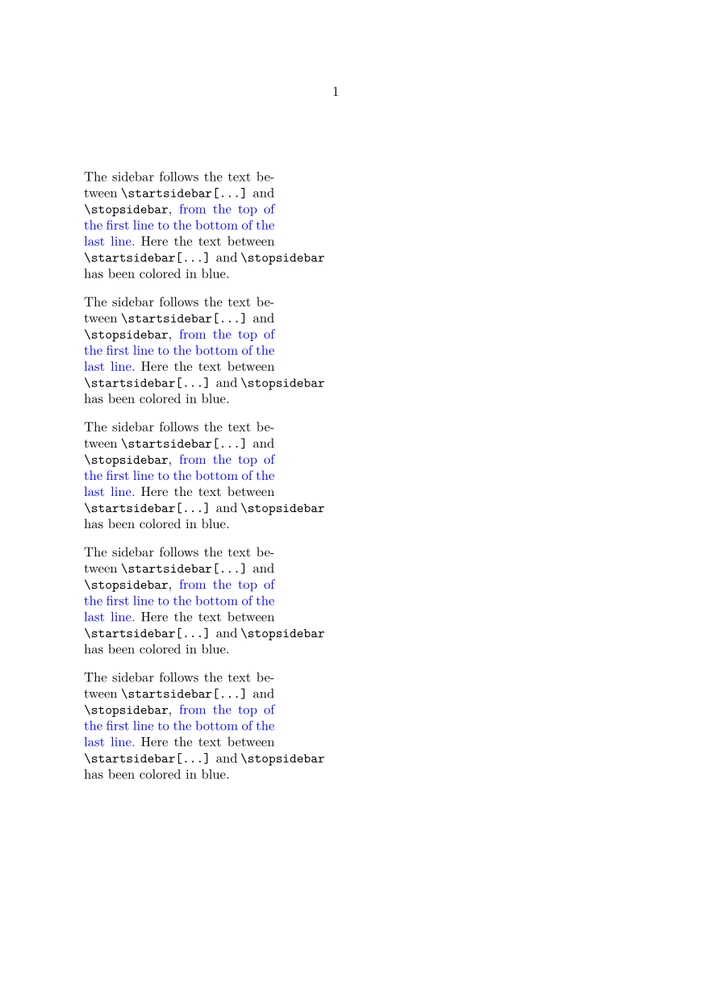 \definesidebar[simple][rulethickness=1pt,distance=4pt] \starttext \hsize=4cm The sidebar follows the text between \type{\startsidebar[simple]} and \type{\stopsidebar}, \startsidebar[simple] {\blue from the top of the first line to the bottom of the last line.}\stopsidebar Here the text between \type{\startsidebar[simple]} and \type{\stopsidebar} has been colored in blue. \blank When the \startsidebar[simple] same bar is started twice on the same text, \startsidebar[simple] a second bar \stopsidebar will be drawn, with an offset equal to the \type{distance} parameter.\stopsidebar \blank \setupsidebar[simple][leftmargindistance=0pt,distance=4pt] When \type{leftmargindistance} is zero, \startsidebar[simple] the bar is drawn at distance \type{distance} from the left edge of the text,\stopsidebar which means 4pt in this example. \blank \setupsidebar[simple][leftmargindistance=0.1pt,distance=4pt] When \type{leftmargindistance} is not zero, \startsidebar[simple] the bar is drawn at distance \type{leftmargindistance} from the left edge of the text, which means 0.1pt in this example. \startsidebar[simple] A second bar will be drawn at distance \type{distance} from the first one.\stopsidebar\stopsidebar \blank \setupsidebar[simple][leftmargindistance=0pt,distance=4mm,rulethickness=2mm,level=1] \definesidebar[over][distance=4mm,rulethickness=1mm,rulecolor=green,level=1] When \startsidebar[simple]\startsidebar[over] two sidebars are in the same level, they are drawn at distance \type{distance}.\stopsidebar\stopsidebar \blank \setupsidebar[over][level=2] When \startsidebar[simple]\startsidebar[over] two sidebars are in different levels, they are drawn as if they were in different layers.\stopsidebar\stopsidebar \blank \setupsidebar[simple][rulethickness=1pt,leftmargindistance=\dimexpr -\hsize - 4pt\relax] \startsidebar[simple] You can put a bar in the right margin.\stopsidebar \stoptext