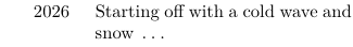 \setuptabulate[unit=5mm] \starttabulate[|li{1}j{0.3}|p(40mm)|] \NC 2026 \NC Starting off with a cold wave and snow \unknown \NC\NR \stoptabulate