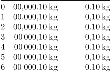 \starttabulate[|r|r|r|] \HL \NC 0 \NC \setupunit[method=0]\unit{00,000.10 kilogram} \NC \setupunit[method=0]\unit{@@,@@0.10 kilogram} \NC \NR \NC 1 \NC \setupunit[method=1]\unit{00,000.10 kilogram} \NC \setupunit[method=1]\unit{@@,@@0.10 kilogram} \NC \NR \NC 2 \NC \setupunit[method=2]\unit{00,000.10 kilogram} \NC \setupunit[method=2]\unit{@@,@@0.10 kilogram} \NC \NR \NC 3 \NC \setupunit[method=3]\unit{00,000.10 kilogram} \NC \setupunit[method=3]\unit{@@,@@0.10 kilogram} \NC \NR \NC 4 \NC \setupunit[method=4]\unit{00,000.10 kilogram} \NC \setupunit[method=4]\unit{@@,@@0.10 kilogram} \NC \NR \NC 5 \NC \setupunit[method=5]\unit{00,000.10 kilogram} \NC \setupunit[method=5]\unit{@@,@@0.10 kilogram} \NC \NR \NC 6 \NC \setupunit[method=6]\unit{00,000.10 kilogram} \NC \setupunit[method=6]\unit{@@,@@0.10 kilogram} \NC \NR \HL \stoptabulate