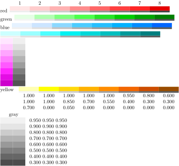 % Use the predefined 'dem' (demo) colorgroups \usecolors[dem] \showcolorgroup[red][name,number] \showcolorgroup[green][name] \showcolorgroup[blue][name] \showcolorgroup[cyan][horizontal] \showcolorgroup[magenta][vertical] \showcolorgroup[yellow][name,value] \showcolorgroup[gray][vertical,name,value]