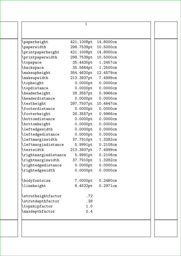 Displays information about the papersize, margins, fontsize and how to access the information in your TeX file. Draws a frame around the text area, the margins, and the edge of the paper.