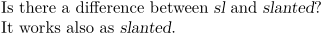 Is there a difference between {\sl sl} and {\slanted slanted}? It works also as \slanted{slanted}.