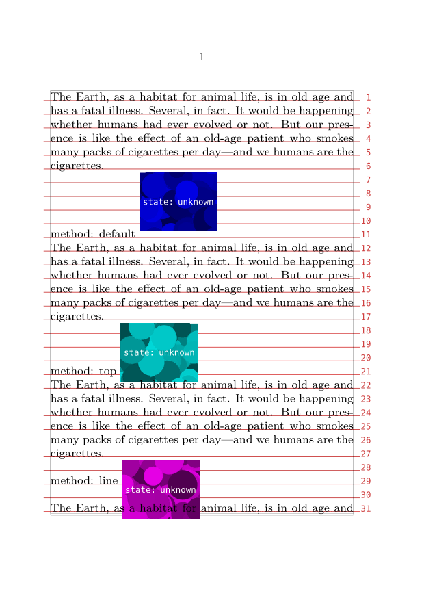 \useMPlibrary [dum] \setuppapersize [A6] \showgrid \setuplayout [grid=yes] %% set the global snap method \def \makedummy { %% create a dummy figure with a vsize that is not a multiple of the %% leading \externalfigure [dummy] [height=\dimexpr4.25\lineheight]% } \starttext \input ward \par method: default \snaptogrid\vbox{\makedummy} \par \input ward \par method: top \snaptogrid [top] \vbox{\makedummy} \par \input ward \par method: line \snaptogrid [line] \vbox{\makedummy} \par \input ward \par \stoptext