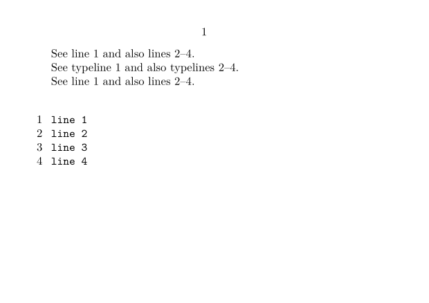 \setuppapersize[A7,landscape] % Ensure that the /BTEX.../ETEX escape is active inside \starttyping \setuptyping[numbering=line,escape=yes] \starttext See \inline[line:single] and also \inline[line:range]. \crlf See \inline{typeline}[line:single] and also \inline{typelines}[line:range].\crlf See line~\inlinerange[line:single] and also lines~\inlinerange[line:range].\crlf \starttyping line 1/BTEX\someline[line:single]/ETEX line 2/BTEX\startline[line:range]/ETEX line 3 line 4/BTEX\stopline[line:range]/ETEX \stoptyping \stoptext