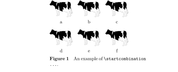 \setupexternalfigures[location={local, default}] \placefigure [here] % figure placement [fig:combinations] % figure reference {An example of \type{\startcombination...}.} % figure caption {\startcombination[3*2] % contents of the figure: a combination % first row {\externalfigure[cow][height=1cm]} {a} % subfigure and subcaption {\externalfigure[cow][height=1cm]} {b} {\externalfigure[cow][height=1cm]} {c} % second row {\externalfigure[cow][height=1cm]} {d} {\externalfigure[cow][height=1cm]} {e} {\externalfigure[cow][height=1cm]} {f} \stopcombination}