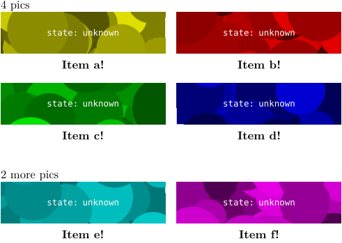 \useMPlibrary[dum] \definecombination[mycombi][alternative=label] \setuplabel[combination:mycombi][ text={Item }, numberconversion=character, stopper=!, ] 4 pics \startcombination[mycombi][2*2] {\externalfigure[dummy][width=4cm,height=1cm]} {\externalfigure[dummy][width=4cm,height=1cm]} {\externalfigure[dummy][width=4cm,height=1cm]} {\externalfigure[dummy][width=4cm,height=1cm]} \stopcombination \blank[2*big] 2 more pics \startcombination[mycombi][nx=2,ny=1,continue=yes] {\externalfigure[dummy][width=4cm,height=1cm]} {\externalfigure[dummy][width=4cm,height=1cm]} \stopcombination