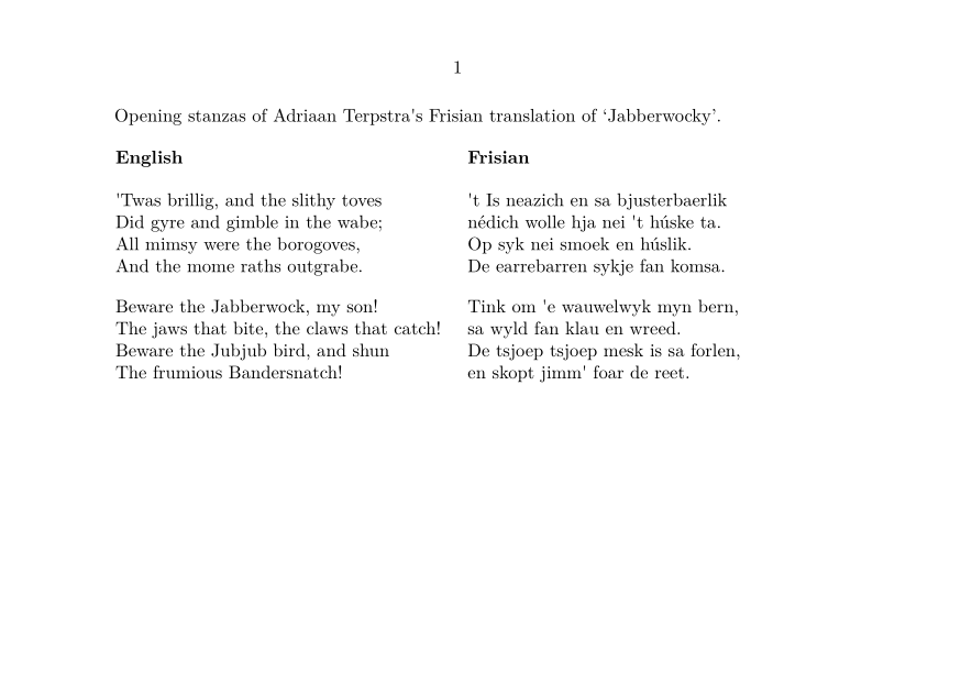 \setuppapersize[A6,landscape] \defineparagraphs[EnglishFrisian][n=2] \starttext Opening stanzas of Adriaan Terpstra's Frisian translation of \quote{Jabberwocky}. \startparagraphs[EnglishFrisian] \bf{English} \nextEnglishFrisian \bf{Frisian} \stopparagraphs \startparagraphs[EnglishFrisian] \obeylines 'Twas brillig, and the slithy toves Did gyre and gimble in the wabe; All mimsy were the borogoves, And the mome raths outgrabe. \nextEnglishFrisian \obeylines 't Is neazich en sa bjusterbaerlik n\'edich wolle hja nei 't h\'uske ta. Op syk nei smoek en h\'uslik. De earrebarren sykje fan komsa. \stopparagraphs \startparagraphs[EnglishFrisian] \obeylines Beware the Jabberwock, my son! The jaws that bite, the claws that catch! Beware the Jubjub bird, and shun The frumious Bandersnatch! \nextEnglishFrisian \obeylines Tink om 'e wauwelwyk myn bern, sa wyld fan klau en wreed. De tsjoep tsjoep mesk is sa forlen, en skopt jimm' foar de reet. \stopparagraphs \stoptext