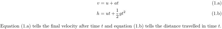 \setuplayout[scale=0.8,width=13cm] \startsubformulas[eq:total] \startplaceformula \startformula \startalign \NC v \NC = u + at \NR[eq:v] \NC h \NC = ut + \frac12 gt^2 \NR[eq:h] \stopalign \stopformula \stopplaceformula \stopsubformulas Equation~(\in[eq:v]) tells the final velocity after time~$t$ and equation (\in[eq:h]) tells the distance travelled in time~$t$.