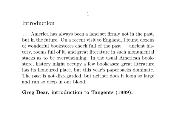 \setuppapersize[A7,landscape] \starttext \subject{Introduction} \unknown\ America has always been a land set firmly not in the past, but in the future. On a recent visit to England, I found dozens of wonderful bookstores chock full of the past --- ancient history, rooms full of it, and great literature in such monumental stacks as to be overwhelming. In the usual American bookstore, history might occupy a few bookcases; great literature has its honoured place, but this year’s paperbacks dominate. The past is not disregarded, but neither does it loom so large and run so deep in our blood. \blank {\bf Greg Bear, introduction to Tangents (1989).} \stoptext