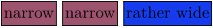 \startuniqueMPgraphic{randomcolor} fill unitsquare xyscaled (\overlaywidth, \overlayheight) % `uniformdeviate 1` produces a random number between 0 and 1 withcolor (uniformdeviate 1, uniformdeviate 1, uniformdeviate 1); \stopuniqueMPgraphic \defineoverlay [beta] [\uniqueMPgraphic{randomcolor}] \dontleavehmode \framed[background=beta]{narrow} \framed[background=beta]{narrow} \framed[background=beta]{rather wide}