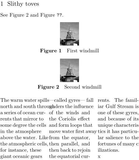 \setuppapersize[A6] % Tell ConTeXt where the windmill picture is \setupexternalfigures[location={default}] \version[temporary] \section{Slithy toves} % Top right of page will show successful reference '< fig2' % Left margin will mention unsuccessful reference 'figNothing->' See \in{Figure}[fig2] and \in{Figure}[figNothing]. % Top right of page will show new-created anchors '> fig1' and '> fig2' % Top right of page will show successfully placed floats \placefigure[here][fig1]{First windmill}{ \externalfigure[mill][width=1cm] } \placefigure[here][fig2]{Second windmill}{ \externalfigure[mill][width=1cm] } \startcolumns[n=3] % Overfull lines will have slugs in colum margins. \input linden % Underfull hboxes get no warning x \stopcolumns