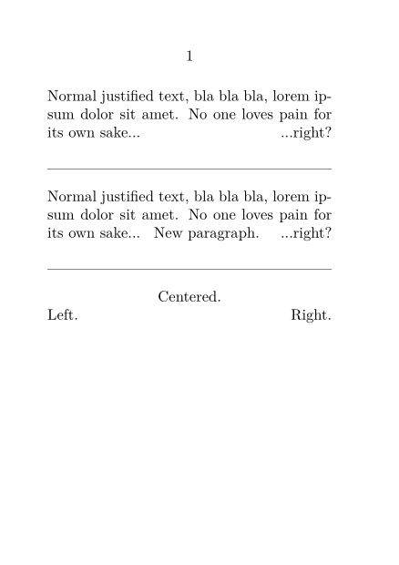 \setuppapersize[A7] \setupwhitespace[big] \starttext \startalignment[normal] Normal justified text, bla bla bla, lorem ipsum dolor sit amet. No one loves pain for its own sake... \wordright{...right?} \stopalignment \thinrule \startalignment[normal] Normal justified text, bla bla bla, lorem ipsum dolor sit amet. No one loves pain for its own sake... \wordright{...right?} New paragraph. \stopalignment \thinrule \startalignment[middle] Centered. \\ Left. \wordright{Right.} \stopalignment \stoptext