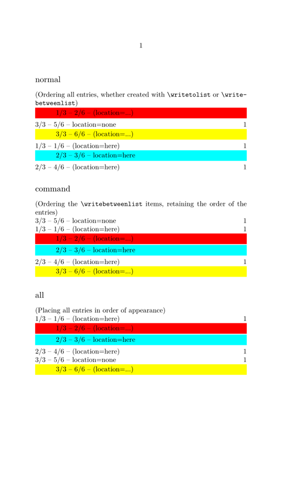 \definepapersize[scroll][width=12cm, height=20cm] \setuppapersize[scroll] \definelist[testlist][criterium=all] \starttext \subject{normal} (Ordering all entries, whether created with \tex{writetolist} or \tex{writebetweenlist}) \placelist[testlist] \subject{command} (Ordering the \tex{writebetweenlist} items, retaining the order of the entries) \placelist[testlist][order=command] \subject{all} (Placing all entries in order of appearance) \placelist[testlist][order=all] % --- and now we put write the entries to the list --- \writetolist [testlist] {1} {1/3 -- 1/6 -- (location=here)} \writebetweenlist[testlist]{ \framed[width=\hsize, frame=off, background=color, backgroundcolor=red, align=flushleft] {\blackrule[width=2.5em, height=0em] 1/3 -- 2/6 -- (location=...)}} \writebetweenlist[testlist][location=here]{ \framed[width=\hsize, frame=off, background=color, backgroundcolor=cyan, align=flushleft] {\blackrule[width=2.5em, height=0em] 2/3 -- 3/6 -- location=here}} \writetolist [testlist] {2} {2/3 -- 4/6 -- (location=here)} \writetolist [testlist][location=none]{W} {3/3 -- 5/6 -- location=none} \writebetweenlist[testlist]{ \framed[width=\hsize, frame=off, background=color, backgroundcolor=yellow, align=flushleft] {\blackrule[width=2.5em, height=0em] 3/3 -- 6/6 -- (location=...)}} \stoptext