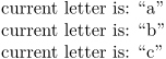\doloopoverlist {a, b, c} {current letter is: “\recursestring”\par}