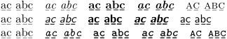 \doloopoverlist{\tf,\ss,\tt} {\bgroup\recursestring\doloopoverlist{\rm,\it,\bf,\bi,\sc} {\bgroup\recursestring a̱ḇc̱ a̲b̲c̲\quad\egroup}\egroup\par}