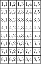 \bTABLE \dorecurse{8}{ \bTR \dorecurse{5}{\bTD #1,##1 \eTD} \eTR } \eTABLE