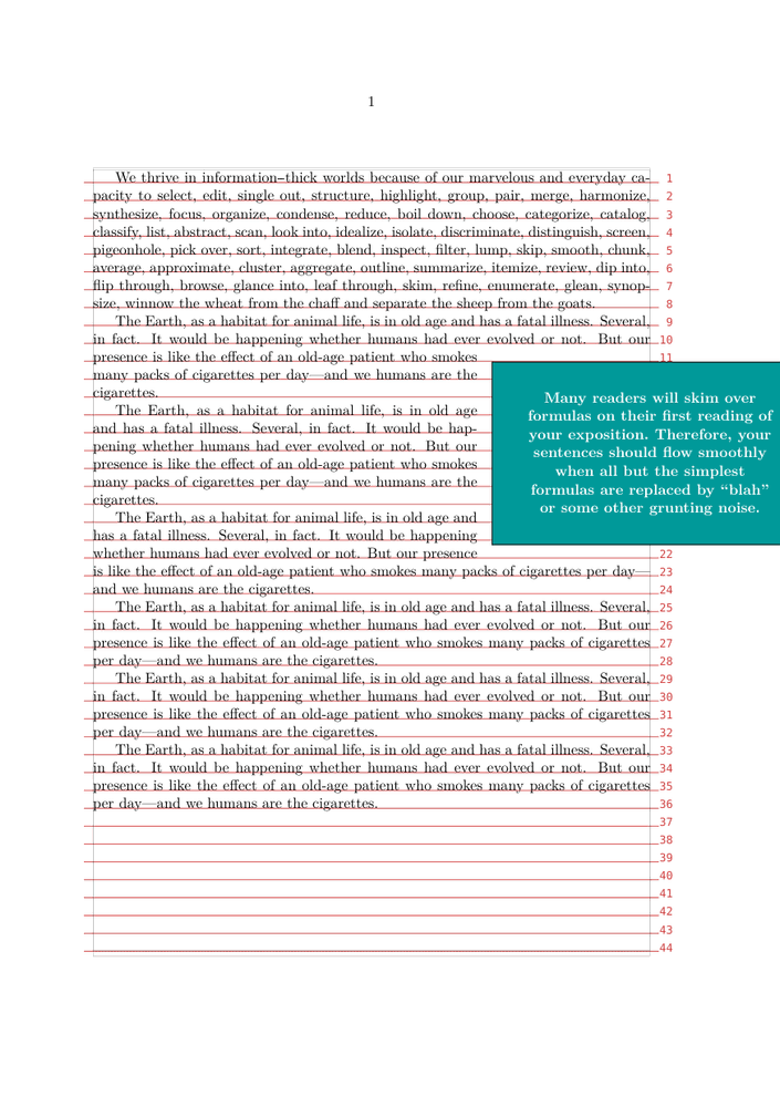 \setuplayout [grid=on] \showgrid \defineframed [Quote] [align={middle,lohi}, foregroundstyle=bold, foregroundcolor=white, background=color, backgroundcolor=middlecyan, width=6cm, offset=.5cm, ] \definefloat [Quotefloat] \setupindenting[yes,medium] \starttext \samplefile{tufte} \startplacefloat [Quotefloat] [location={right,none,2*hang}] \startframed[Quote] \samplefile{knuthmath} \stopframed \stopplacefloat \dorecurse{6}{\samplefile{ward}\par} \stoptext