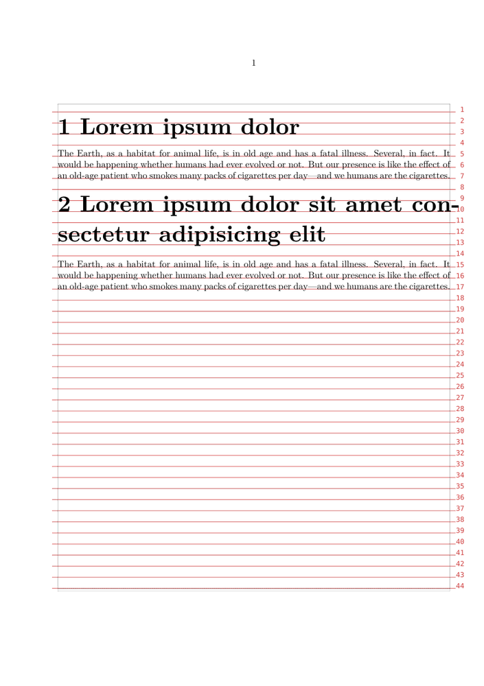 \setuplayout [grid=yes, width=12cm] \definefont [BigFont] [Bold at 20pt] [26pt] \setuphead [section] [style=\BigFont] \showgrid \starttext \startsection [title=Lorem ipsum dolor] \input ward \stopsection \startsection [title={Lorem ipsum dolor sit amet consectetur adipisicing elit}] \input ward \stopsection \stoptext