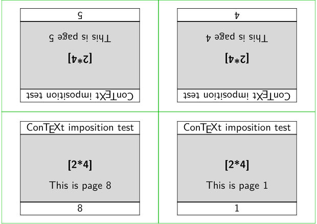 \def\Schema{2*4} \setuppapersize[A9,landscape][A7,landscape] % the schema being tested \setuparranging [\Schema] % Visuals \setupbodyfont[ss,10pt] \setuplayout [margin=0pt, width=fit, header=2.8ex, footer=2.8ex] \setupalign[middle,hilo] \setuppagenumbering [alternative=doublesided,location=footer] \setupheadertexts[\CONTEXT\ imposition test] \showframe \setupbackgrounds [text][text][background=color,backgroundcolor=lightgray] % Where the block of pages is placed on the sheet % (relevant if there is space left over.) \setuplayout [location=middle,marking=on] \startbuffer[Fakepage] \strut \blank \bold{[\Schema]} \vfill This is page \recurselevel \vfill \stopbuffer \starttext \dorecurse{16}{\getbuffer[Fakepage]\page} \stoptext