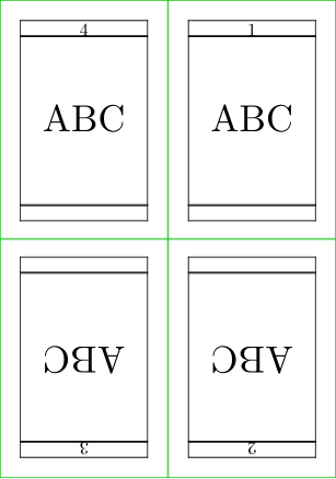% Adapted from page-imp.mkiv \installpagearrangement 1*4*reversed {\dosetuparrangement{2}{2}{4}{3}{3}% X,Y,Total,hcutmarks,vcutmarks \pusharrangedpageFOURSINGLESIDEDFOLDEDREVERSED\poparrangedpagesTWO\relax} \def\pusharrangedpageFOURSINGLESIDEDFOLDEDREVERSED#1% {\advancearrangedpageN \reportarrangedpage\arrangedpageN \ifcase\arrangedpageN \or \handlearrangedpageXandY{#1}010\arrangedpageA % 1 rot,hskip,vskip \or \handlearrangedpageXandY{#1}111\arrangedpageA % 2 \or \handlearrangedpageXandY{#1}101\arrangedpageA % 3 \or \handlearrangedpageXandY{#1}000\arrangedpageA % 4 \poparrangedpages \fi} \setuppapersize [A10][A8] \setuparranging [1*4*reversed] \setuplayout [margin=0pt, width=fit] \showframe \starttext \dorecurse{4}{\vbox to \textheight{\vfill\midaligned{\tfd ABC}\vfill}\page} \stoptext