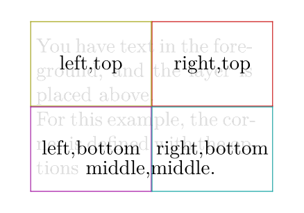 \setuppapersize[A8,landscape] \setupheadertexts [] \setupbodyfont[14pt] \setupframed [frame=on, location=top, offset=0pt, rulethickness=0.5pt, strut=yes, width=0.4\paperwidth, height=0.4\paperheight] \definelayer[mybg] [width=\paperwidth, height=\paperheight, corner={middle,middle}] \setlayer[mybg] [location={right,top}] {\framed[framecolor=middlered]{right,top}} \setlayer[mybg] [location={left,top}] {\framed[framecolor=middleyellow]{left,top}} \setlayer[mybg] [location={left,bottom}] {\framed[framecolor=middlemagenta]{left,bottom}} \setlayer[mybg] [location={right,bottom}] {\framed[framecolor=middlecyan]{right,bottom}} \starttext \setupbackgrounds[page][background={foreground,mybg}] \color[lightgray] {You have text in the foreground, and the layer is placed above.\\ For this example, the corner is defined with the options} middle,middle. \stoptext