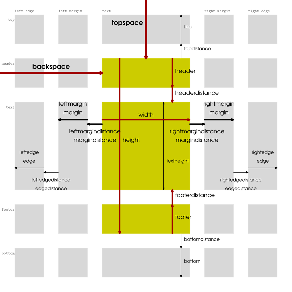 backspaceandwidth, and thetopspaceandheight. Thewidthis the width of the main typesetting area; thebackspaceis its distance from the left edge of the page. Theheightis the distance from the top of the header to the bottom of the footer ; thetopspaceis the distance from the top edge of the page to the top of the header. -