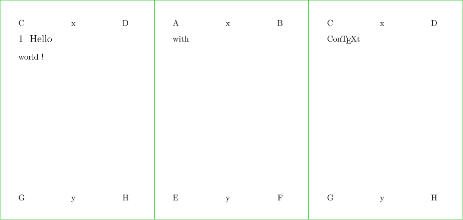 \definepapersize[sheet][width=156mm,height=74mm] \setuppapersize[A8][sheet] \setuppaper[nx=3,ny=1] \setuparranging[XY] \showframe[edge] \setupheadertexts [x] \setupheadertexts [C] [D] [B] [A] \setupfootertexts [y] \setupfootertexts [G] [H] [F] [E] \starttext \startsection[title=Hello] world ! \page with \page \ConTeXt \stopsection \stoptext