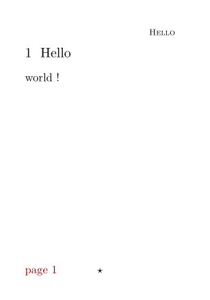 \setuppapersize[A8] \setupheadertexts [] % To make it empty \setupheadertexts [] [{\tfx\sc\getmarking[section]}] \setupfootertexts [{\star}] \setupfootertexts [{\color[darkred]{page \pagenumber}}] [] \starttext \startsection[title=Hello] world ! \stopsection \stoptext