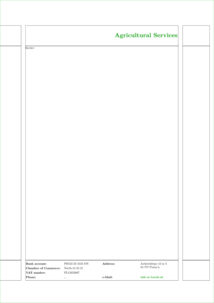 \setuppapersize[A4] \setupinteraction[state=start] \showframe \startsetups[Header] %< HERE \framed [height=\headerheight, align=lohi, frame=off, foregroundcolor=darkgreen, foregroundstyle=\bfd] {Agricultural Services} \stopsetups \startsetups[Footer] %< HERE \switchtobodyfont[8pt] \setupTABLE [width=.25\textwidth, frame=off] \setupTABLE[c][1,3] [foregroundstyle=bold, roffset=1ex, align=flushleft] \bTABLE \bTR \bTD Bank account:\eTD \bTD Pl0123 23 3445 678\eTD \bTD Address:\eTD \bTD[nr=2] Jackowskiego 12 m 3 \\ 61-757 Pozna’n\eTD \eTR \bTR \bTD Chamber of Commerce:\eTD \bTD North-14 53 21\eTD \eTR \bTR \bTD VAT number:\eTD \bTD PL12653007\eTD \eTR \bTR \bTD Phone:\eTD \bTD … \eTD \bTD e-Mail:\eTD \bTD \goto{info at boede.nl} [url(mailto:info@boede.nl)]\eTD \eTR \eTABLE \stopsetups \setupheadertexts [] \setupheadertexts [] [\setups{Header}] % HERE \setupfootertexts [] [\setups{Footer}] % HERE \starttext Invoice \stoptext