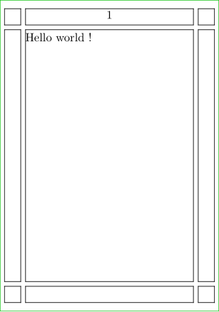 \setuppapersize[A8] \showframe \setuplayout [topspace=2mm, %< Vertically height=70mm, header=4mm, headerdistance=1mm, footer=4mm, footerdistance=1mm, backspace=6mm, %< Horizontally width=40mm, margin=4mm, margindistance=1mm] \starttext Hello world ! \stoptext