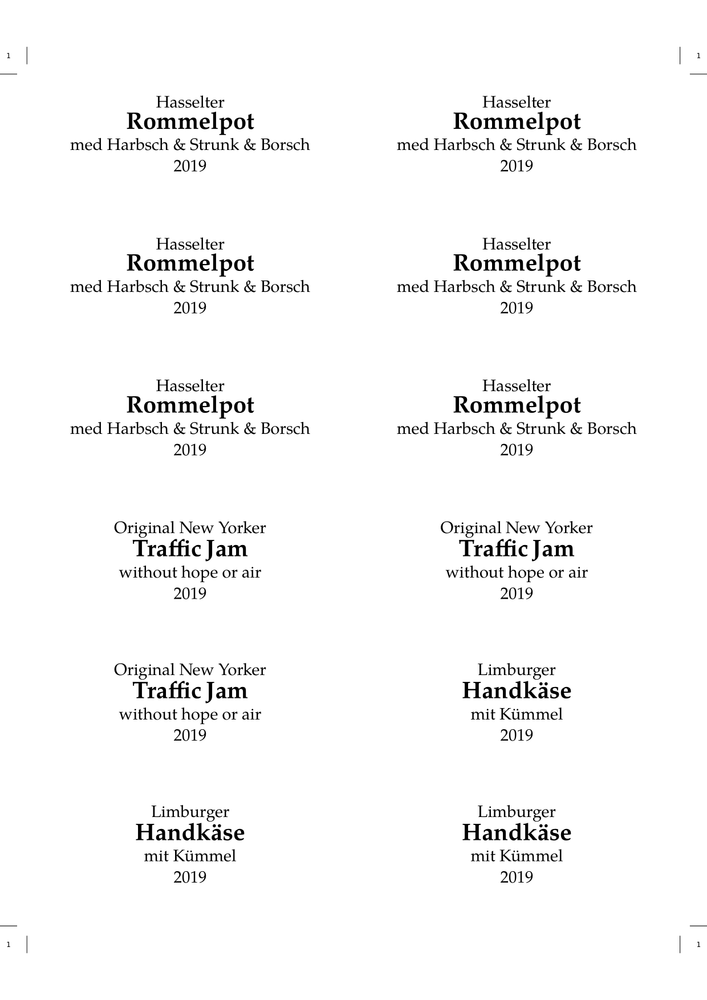 \setupbodyfont [palatino,rm,14pt] \setupinterlinespace[18pt] \definepapersize[Label][width=97mm,height=42.3mm] % size of one label \setuppapersize[Label][A4] \setuppaper[ nx=2, % number of columns ny=6, % number of rows topspace=2.2cm, % from top to first sticker backspace=0.8cm, % from left to sticker %dx=0mm,dy=0mm, % distance between stickers ] % must come before \setuparranging! \setuparranging [XY] \setuplayout[ location=middle, marking=on, topspace=5mm, % within label backspace=5mm, % within label width=87mm, % label width minus border header=0mm, footer=0mm, align=middle, ] \setuppagenumbering[state=stop] \starttext \startlines\startalignment[middle] \dorecurse{6}{ Hasselter {\bfb Rommelpot} med Harbsch & Strunk & Borsch 2019 \page} \dorecurse{3}{ Original New Yorker {\bfb Traffic Jam} without hope or air 2019 \page} \dorecurse{3}{ Limburger {\bfb Handkäse} mit Kümmel 2019 \page} \stopalignment\stoplines \stoptext