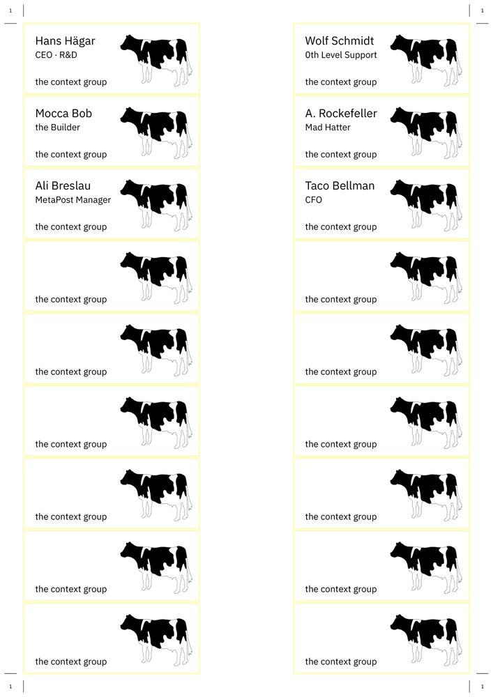 \newdimen\LWidth \newdimen\LHeight \newdimen\LDistanceX \newdimen\LDistanceY \LWidth=75mm \LHeight=30mm \LDistanceX=0mm \LDistanceY=0mm \define[1]\Name{{\switchtobodyfont[14pt]#1}} \define[1]\Title{#1} \mainlanguage[de] \usetypescriptfile [plex] \setupbodyfont [ibmplex,ss,11pt] \setupinterlinespace[16pt] \useMPlibrary[dum] \useexternalfigure[logo][cow][size=art] \definepapersize[Label][width=\LWidth,height=\LHeight] \setuppapersize[Label][A4] \setuppaper[ nx=2, ny=9, topspace=1cm, backspace=1cm, %dx=\LDistanceX, %dy=\LDistanceY, ] % must come before \setuparranging! \setuparranging [XY] \setuplayout[ location=middle, marking=on, topspace=5mm, backspace=5mm, width=68mm, header=0mm, footer=0mm, ] \setuppagenumbering[state=stop] \definelayer[BG][ x=0mm,y=0mm, width=\LWidth,height=\LHeight, state=repeat] \setupbackgrounds[page][background=BG,] \setlayerframed[BG][ frame=on, framecolor=yellow, width=\LWidth,height=\LHeight, align=flushleft, ]{\strut} \setlayer[BG][ preset=rightbottom, hoffset=3mm, voffset=3mm]{% \externalfigure[logo][height=0.75\LHeight]} \setlayer[BG][ preset=leftbottom, hoffset=5mm, voffset=3mm]{% the context group} \starttext \startlines \Name{Hans Hägar} \Title{CEO · R&D} \page \Name{Wolf Schmidt} \Title{0th Level Support} \page \Name{Mocca Bob} \Title{the Builder} \page \Name{A. Rockefeller} \Title{Mad Hatter} \page \Name{Ali Breslau} \Title{MetaPost Manager} \page \Name{Taco Bellman} \Title{CFO} \page \stoplines \stoptext