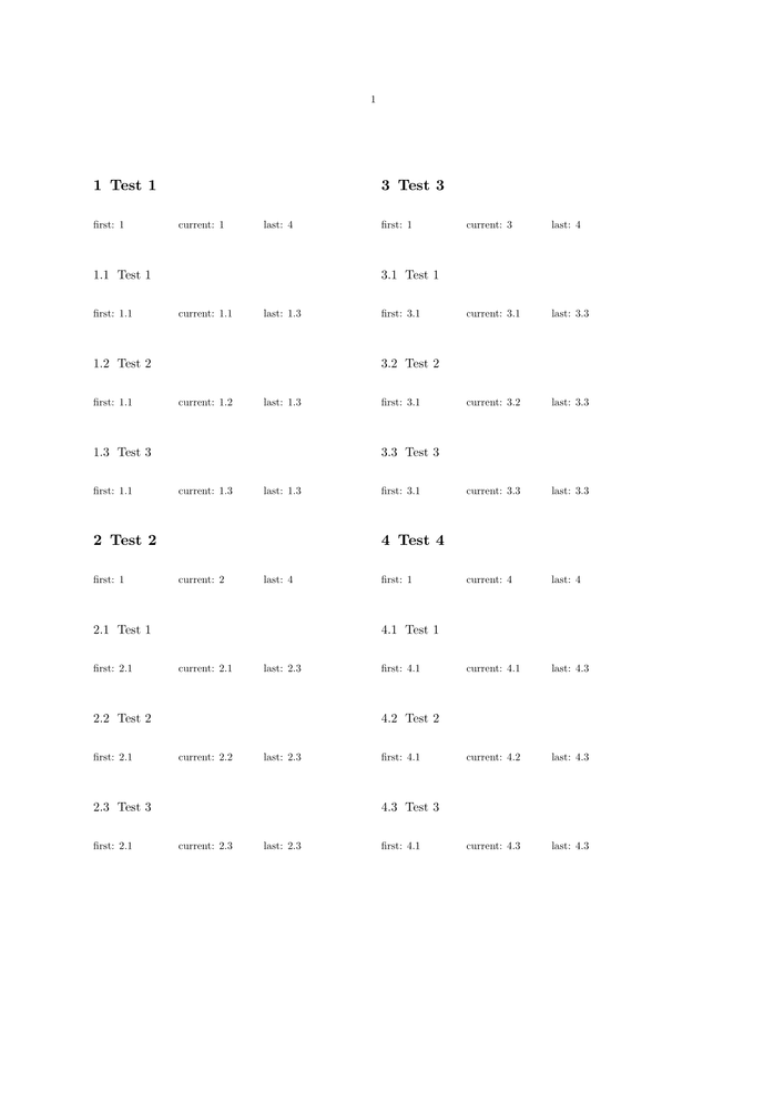 \setuppapersize[A4] \starttext \setuphead[section][style=\bfb] \setuphead[subsection][style=\tfa] \startcolumns[n=2] \dorecurse {4} { \startsection[title={Test \recurselevel}] \starttabulate[|p(2cm)|p(2cm)|p(2cm)|] \NC first: \someheadnumber[section][first] \NC current: \someheadnumber[section][current] \NC last: \someheadnumber[section][last] \NC\NR \stoptabulate \dorecurse {3} { \startsubsection[title={Test \recurselevel}] \starttabulate[|p(2cm)|p(2cm)|p(2cm)|] \NC first: \someheadnumber[subsection][first] \NC current: \someheadnumber[subsection][current] \NC last: \someheadnumber[subsection][last] \NC\NR \stoptabulate \stopsubsection } \stopsection } \stopcolumns \stoptext