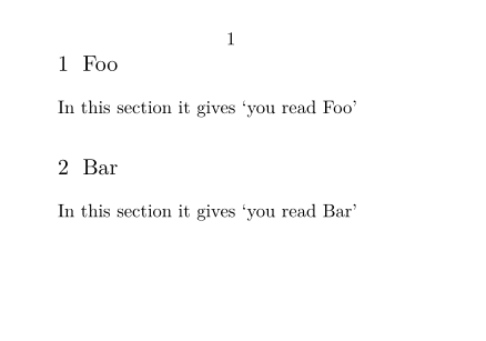 \setuppapersize[A8,landscape] \starttext \startsection [title={Foo}] [varlook={you read Foo}] % extra brackets! In this section it gives \quote{\structureuservariable{varlook}} \stopsection \startsection [title={Bar}] [varlook={you read Bar}] % extra brackets! In this section it gives \quote{\structureuservariable{varlook}} \stopsection \stoptext