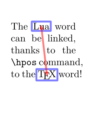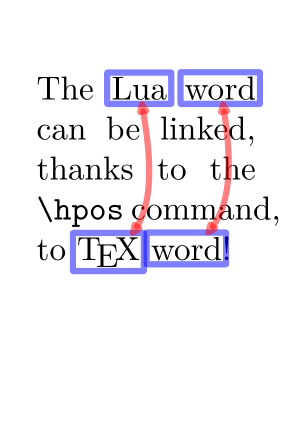 \setupheadertexts[] \setuppapersize[A8] \setupbodyfont[16pt] \setupalign[tolerant] \startMPpositiongraphic{MPMyPage} StartPage ; path pa, pb, pab; pa := (\MPll{\MPvar{from}} -- \MPlr{\MPvar{from}} -- \MPur{\MPvar{from}} -- \MPul{\MPvar{from}} -- cycle) enlarged 2pt; pb := (\MPll{\MPvar{to}} -- \MPlr{\MPvar{to}} -- \MPur{\MPvar{to}} -- \MPul{\MPvar{to}} -- cycle) enlarged 2pt; pab := (center pa){dir(-80)} .. (center pb){dir(-155)}; draw pa withpen pencircle scaled 3pt withcolor transparent(1,0.5,blue); draw pb withpen pencircle scaled 3pt withcolor transparent(1,0.5,blue); pab := pab cutbefore (pab intersectionpoint pa) ; pab := pab cutafter (pab intersectionpoint pb) ; drawdblarrow pab withpen pencircle scaled 3pt withcolor transparent(1,0.5,red); StopPage ; \stopMPpositiongraphic \startpositionoverlay{POLarrows} \setMPpositiongraphic{locA}{MPMyPage}{to=locB} \setMPpositiongraphic{locC}{MPMyPage}{to=locD} \stoppositionoverlay \defineoverlay[OLMyPage][\positionoverlay{POLarrows}] \setupbackgrounds [page] [background={foreground,OLMyPage}] \starttext The \hpos{locA}{\LUA} \hpos{locC}{word} can be linked, thanks to the \tex{hpos} command, to \hpos{locB}{\TeX} \hpos{locD}{word}! \stoptext